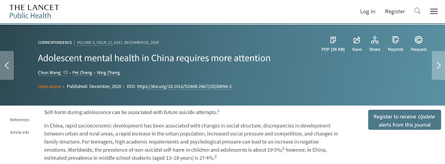 在12月1日国际顶级公共卫生期刊 《柳叶刀·公共卫生》(The Lancet Public Health,影响因子16.292)在线发布的中国特刊中,刊登了我校附属脑科医院王纯团队发表的的通讯文章《中国青少年的心理健康需要更多关注》(Adolescent mental health in China requires more attention)。