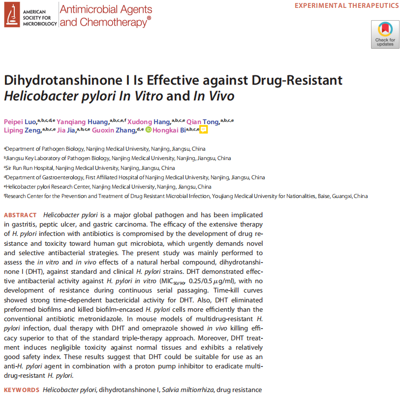 幽门螺杆菌不仅能够导致急、慢性胃炎和胃、十二指肠溃疡及淋巴增生性胃淋巴瘤等疾病,同时还与胃癌和肠道外的肝癌、糖尿病有关,难以彻底治愈。近日,南京医科大学基础医学院毕洪凯团队成功筛选获得新型抗耐药性幽门螺杆菌的候选药物——二氢丹参酮I。该丹参酮单体具有高效快速杀灭幽门螺杆菌、抗幽门螺杆菌生物膜、安全以及不易耐药等优越特性,有望作为一个有前途的抗幽门螺杆菌候选药物进入临床前研究。