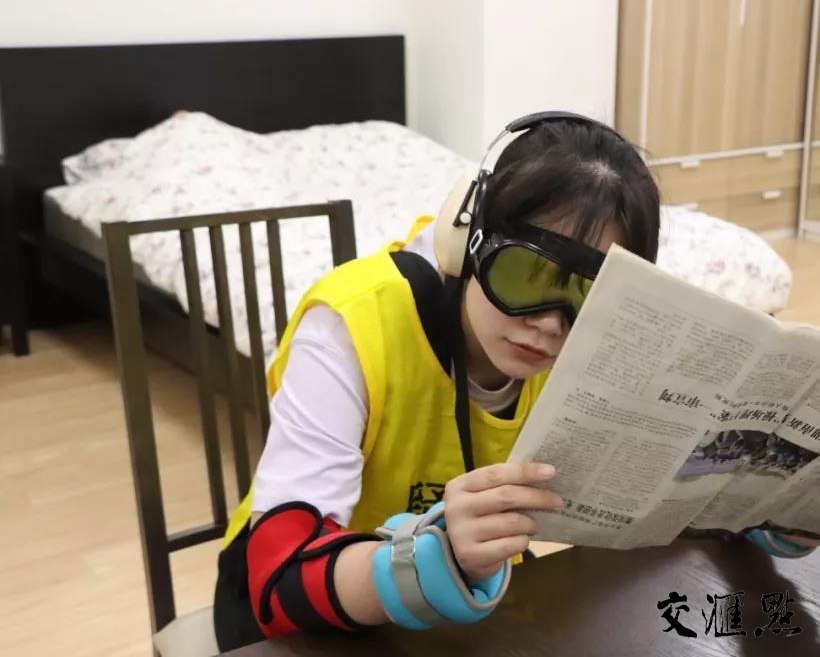 戴上了特制的眼罩,瞬间视线模糊,只能靠拐杖和感觉前行摸索。前来体验的学生试图拾取地上的小饼干时,不得不用双手在地上反复摸索,在身旁人提示下才找到小饼干。在尝试看大字、读报纸和购物清单时,反复将纸拿近拿远,试图努力辨识,却只能依稀看到模糊的重影和一些颜色,可以感受到视线模糊对老人生活的影响。