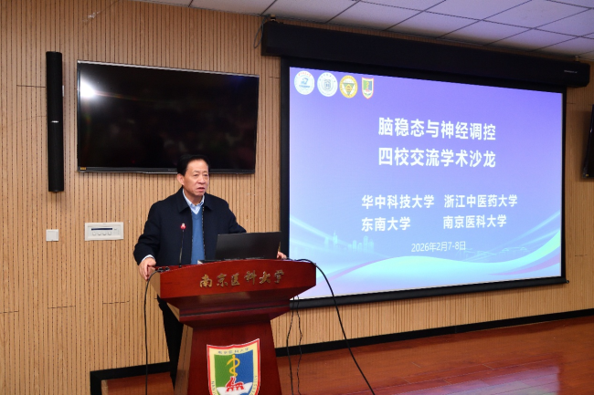 近日,2026年度“脑稳态与神经调控”——南京医科大学、华中科技大学、浙江中医药大学、东南大学交流学术沙龙在江宁校区举行。本次学术沙龙由基础医学院药理学系神经退行性疾病省高校重点实验室主办,来自四校的知名专家学者、青年科研人员及师生代表等近150人出席会议。